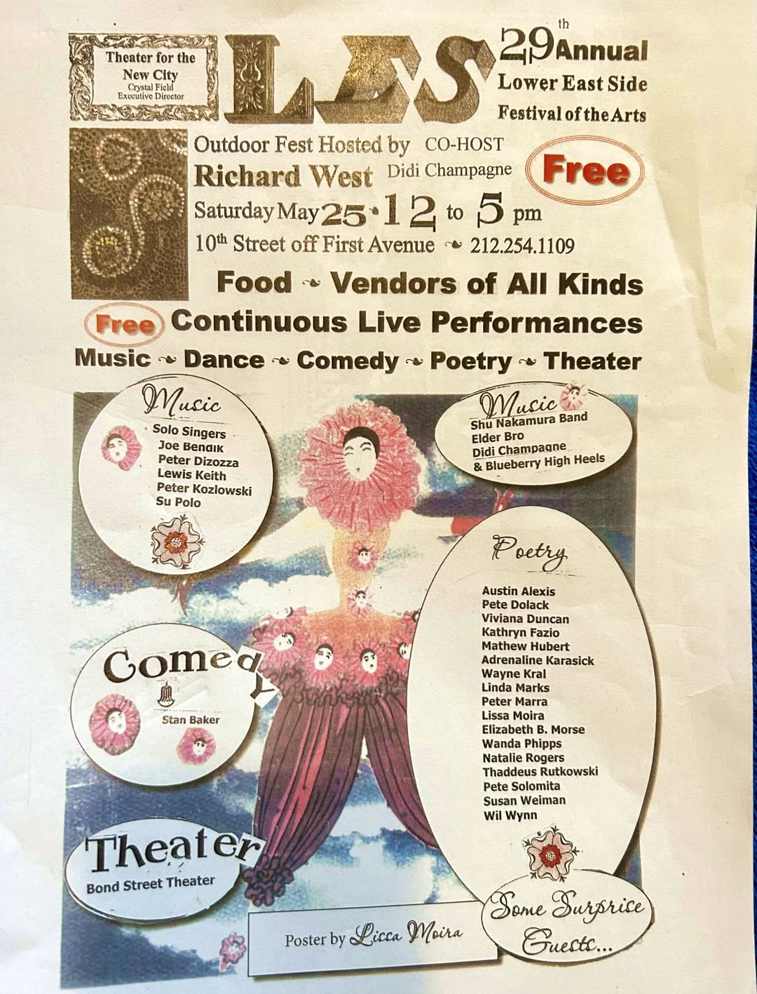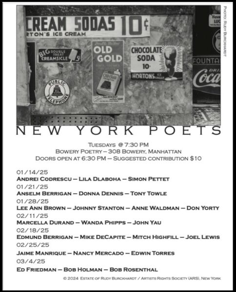 Refreshments availableThis year’s poets and performers include: Bruce Andrews, Penny Arcade, Barbara Barg, Anselm Berrigan, Eddie Bell, Edmund Berrigan, Eric Bogosian, Donna Brook, Lee Ann Brown, Michael Brownstein, Dana Bryant, John Cale, David Cameron, Jim Carroll, Miles Champion, Yoshiko Chuma, Chris Rael/Church of Betty, Todd Colby, John Coletti, Brenda Coultas, Jordan Davis, Maggie Dubris, Douglas Dunn, Marcella Durand, Marty Ehrlich, Maggie Estep, Merry Fortune, Tonya Foster, Ed Friedman, Gregory Fuchs, Joanna Fuhrman, Cliff Fyman, Gordon Gano, Philip Glass, John Godfrey, Nada Gordon, Ted Greenwald, Kimiko Hahn, John S. Hall, Janet Hamill, Marcella Harb, Richard Hell, David Henderson, Robert Hershon, Bob Holman, Vicki Hudspith, Erica Hunt, Lisa Jarnot, Patricia Spears Jones, Lenny Kaye, Tuli Kupferberg, Bill Kushner, Denizé Lauture, Rachel Levitsky, Brendan Lorber, Michael Lydon, Kimberly Lyons, Jackson Mac Low, Judith Malina, Taylor Mead, Sharon Mesmer, Ange Mlinko, Rebecca Moore, Elinor Nauen, Murat Nemet-Nejat, Jim Neu & Blackeyed Susan, Dael Orlandersmith, Maureen Owen, Simon Pettet, Wanda Phipps, Rev. Pedro Pietri, Kristin Prevallet, Hanon Reznikov, Vernon Reid, Reno, Marc Ribot, Bob Rosenthal, Douglas Rothschild, Tom Savage, Sally Silvers, Jenny Smith, Patti Smith, Christopher Stackhouse, Gary Sullivan, Anne Tardos, Lynne Tillman, Edwin Torres, Tony Towle, Lourdes Vazquez, Paul Violi, Anne, Waldman, Jo Ann Wasserman, Africa Wayne, Emily XYZ, John Yau, Don Yorty, Nick Zedd, and more. ***